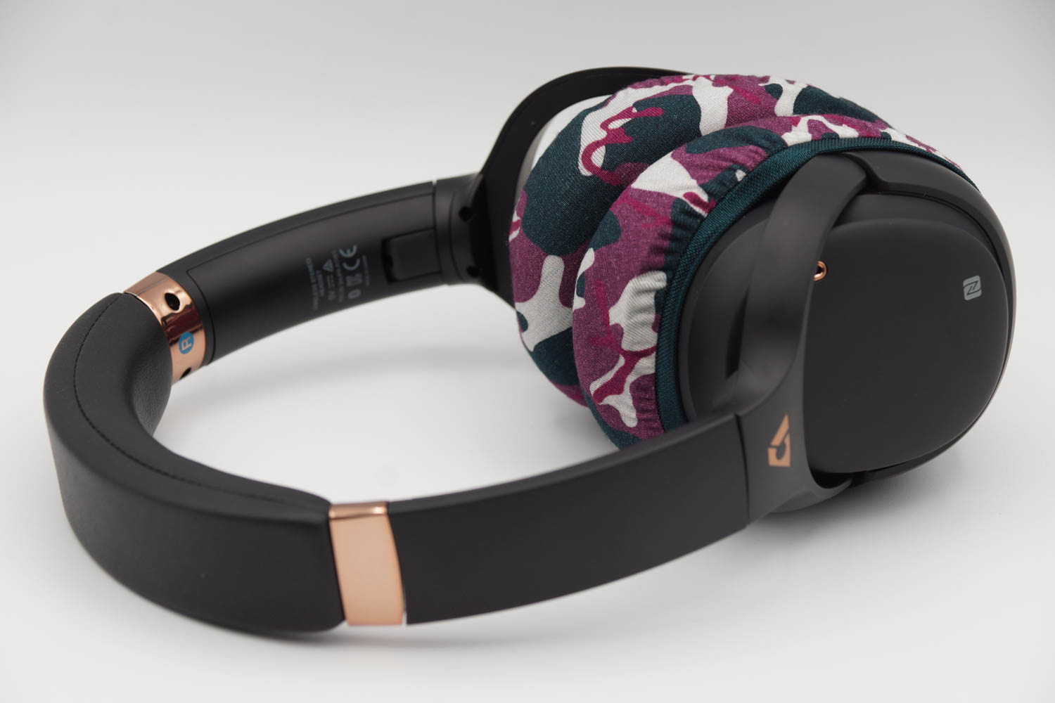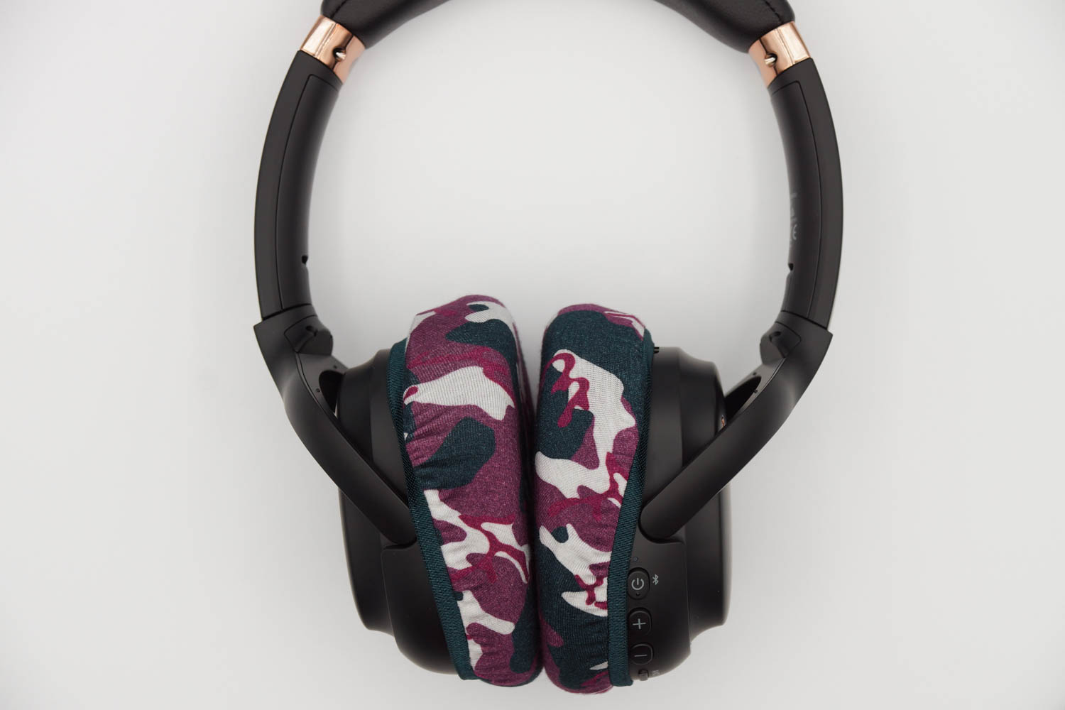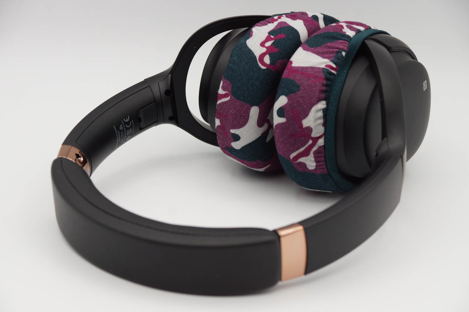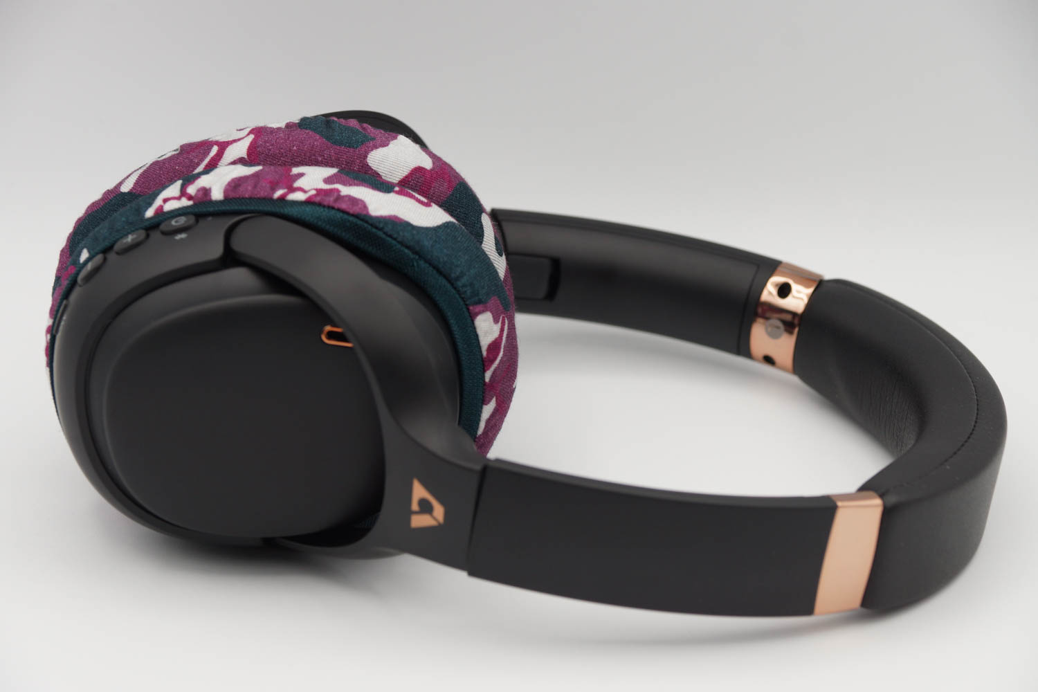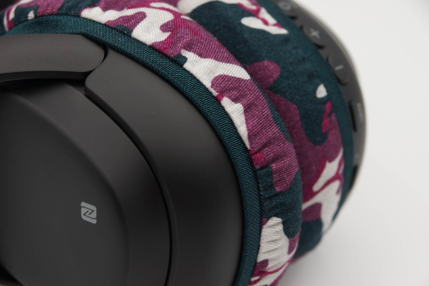 右側のイヤーカップにカバーを被せる際、イヤーカップの上半分は、ヘッドバンドとの接続部のヒンジの部分とイヤーカップの間の段差にゴムをひっかけるように装着し、イヤーカップの下の部分はゴムバンドがボタン類を隠さない程度に浅く被せます。左側のイヤーカップも同様に右側と同じ程度の深さになるように被せてください。(上の写真をご参照ください)