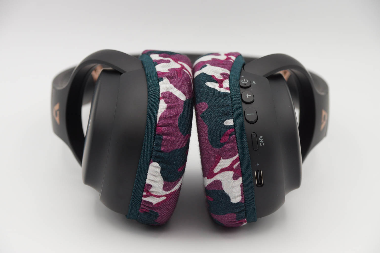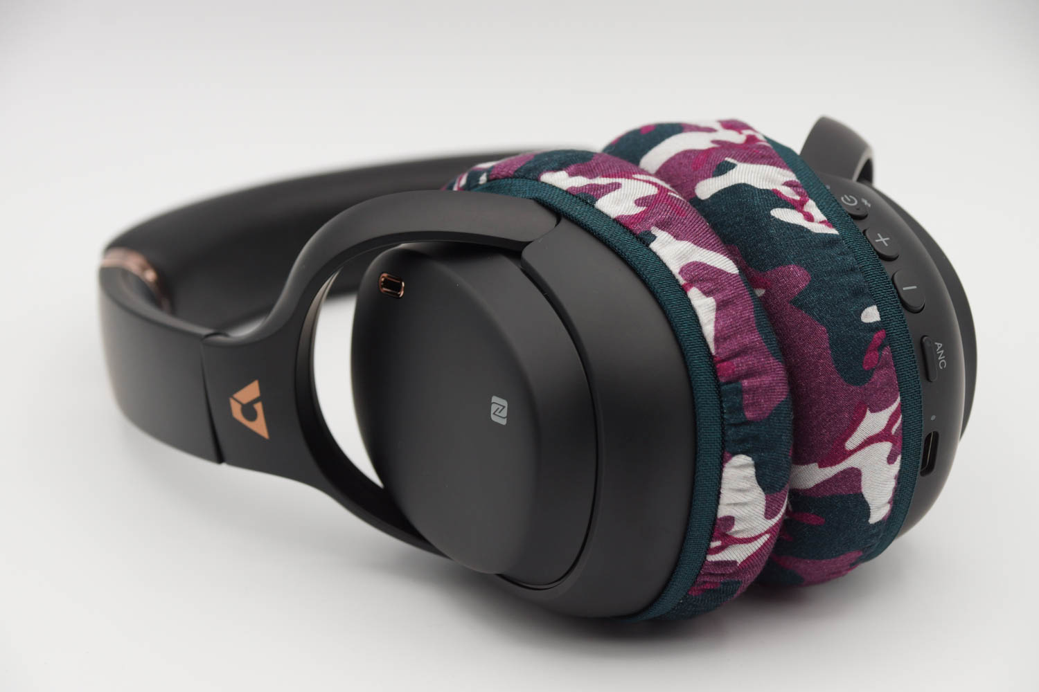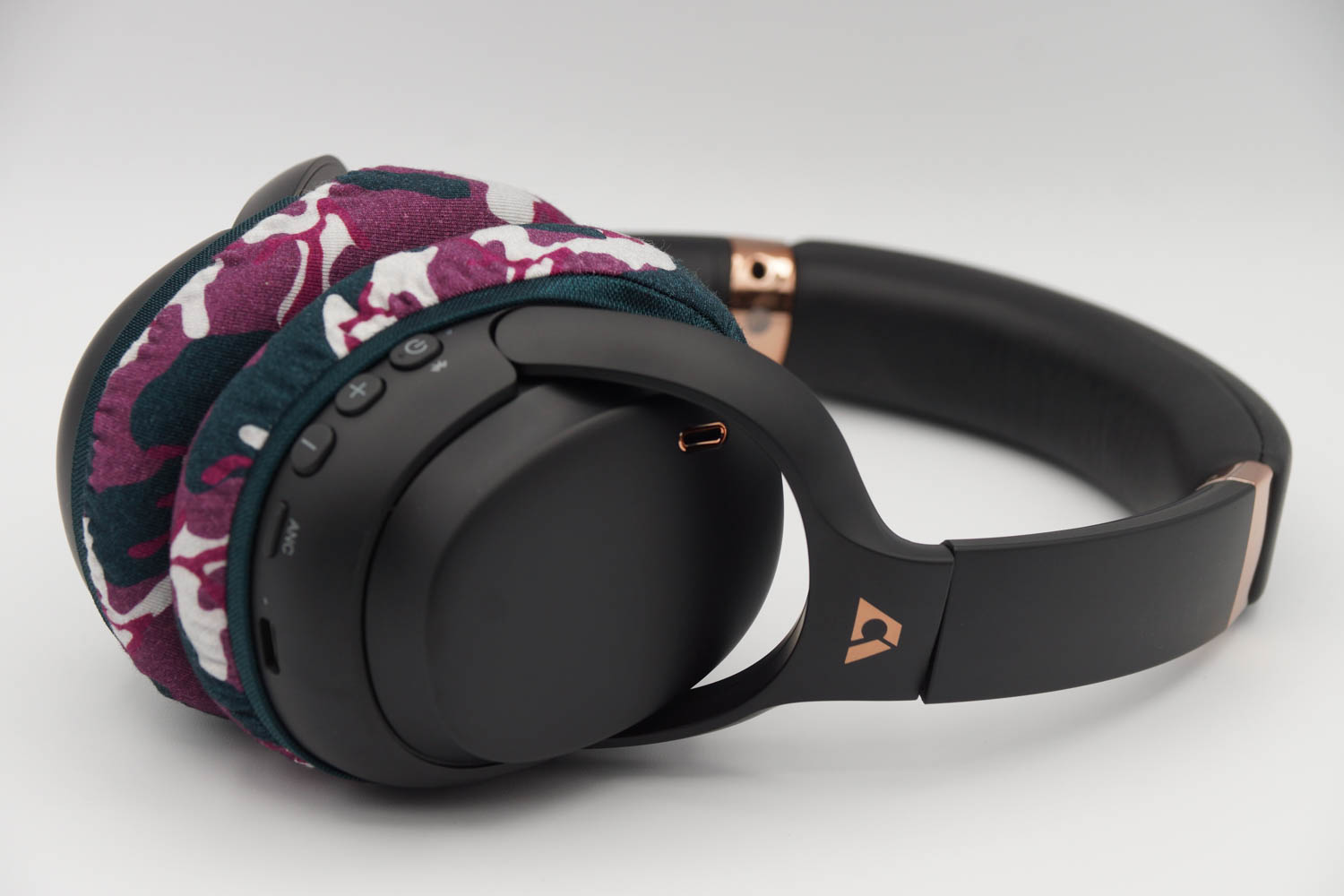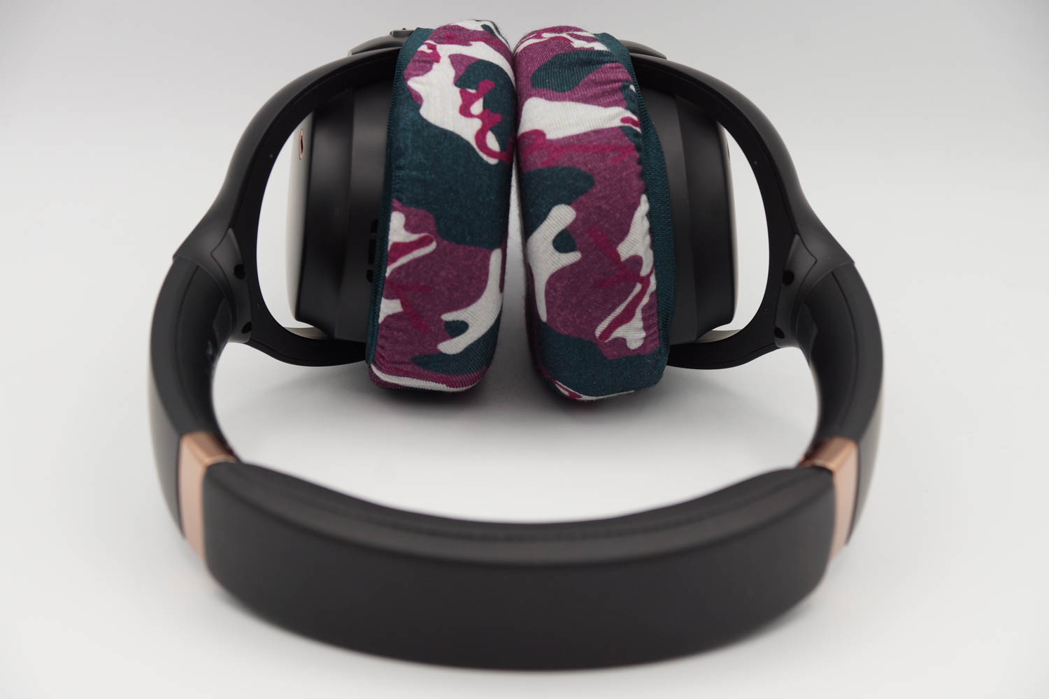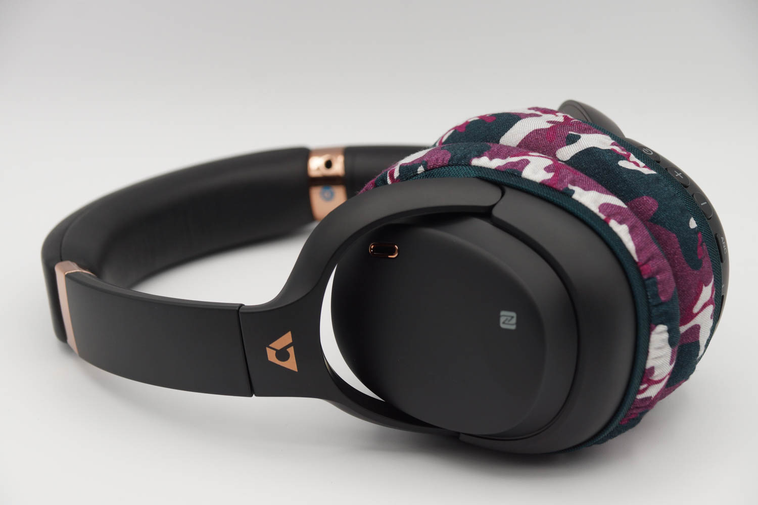 右側のイヤーカップにカバーを被せる際、イヤーカップの上半分は、ヘッドバンドとの接続部のヒンジの部分とイヤーカップの間の段差にゴムをひっかけるように装着し、イヤーカップの下の部分はゴムバンドがボタン類を隠さない程度に浅く被せます。左側のイヤーカップも同様に右側と同じ程度の深さになるように被せてください。(上の写真をご参照ください)