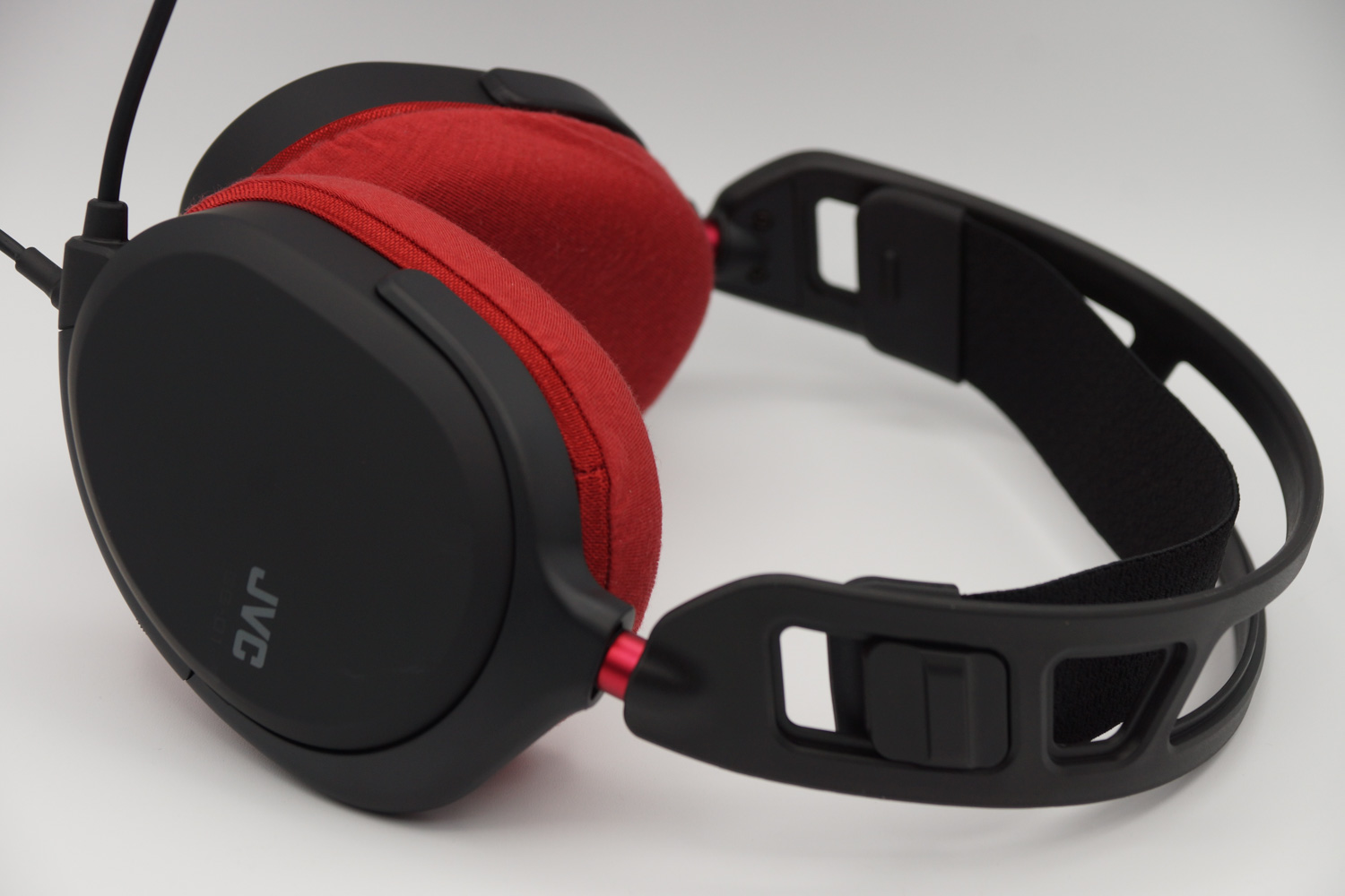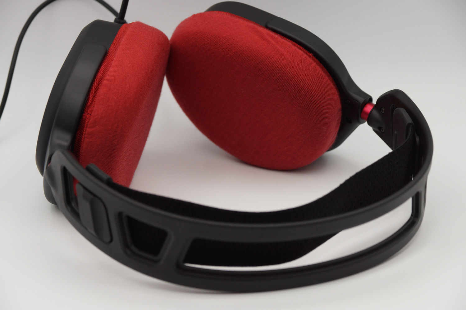 本罩子在纵向和横向的伸展率不同,纵向更有弹性。由于本耳机的耳机垫是竖直延长的,所以罩子也应该竖直(更有弹性的方向)对齐,这样会更舒适。