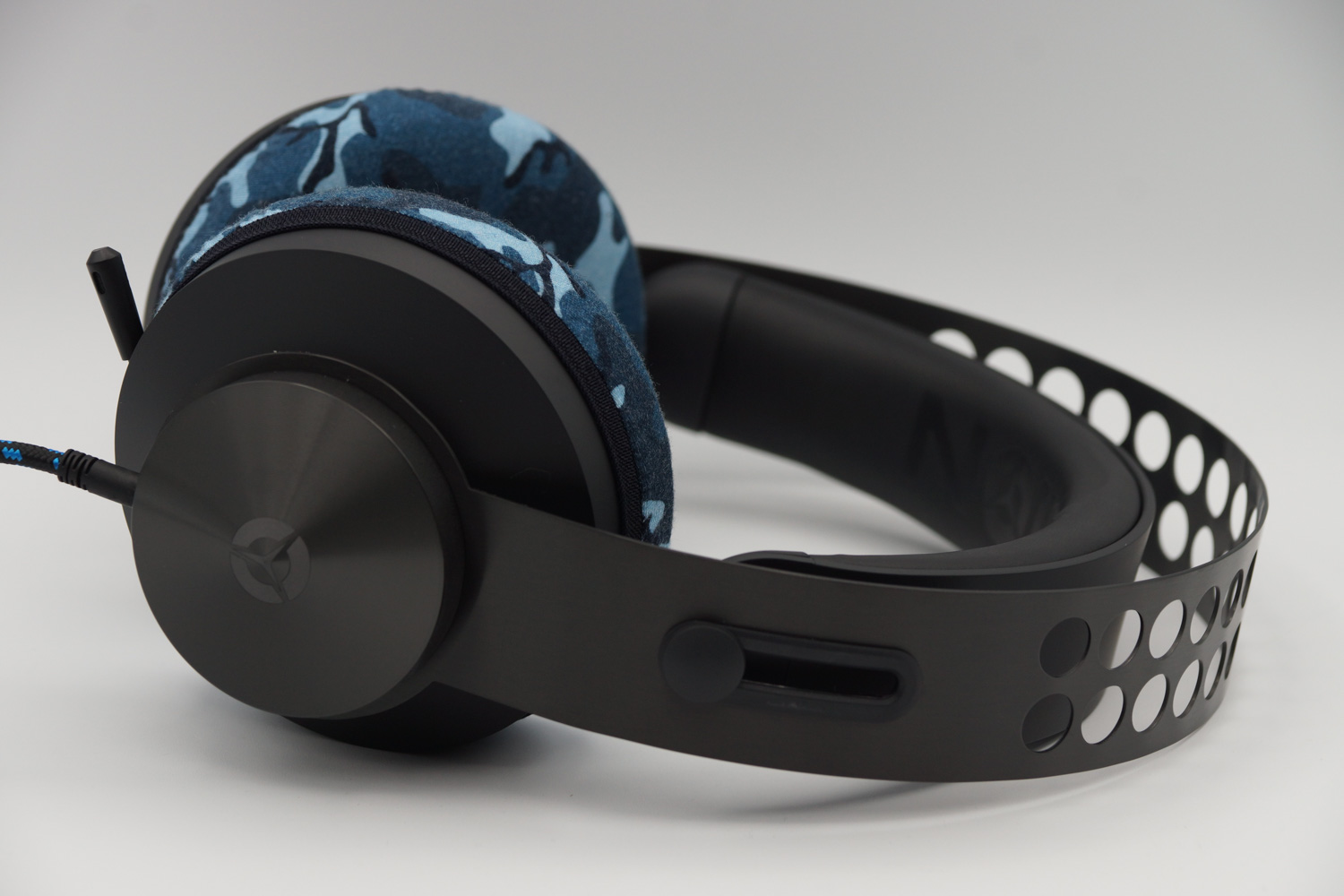 此耳机是“Lenovo”的有线游戏耳机,包括PC在内,提供了一系列技术产品。其独特的设计,有如冲孔金属的坚固头带和机械耳杯外壳,给人一种硬朗且酷炫的印象。与此相反,耳垫和头带的缓冲非常柔软,压力低,佩戴舒适。此外,尽管耳垫的外形是圆形的,但内部是椭圆形的,易于适应耳朵。