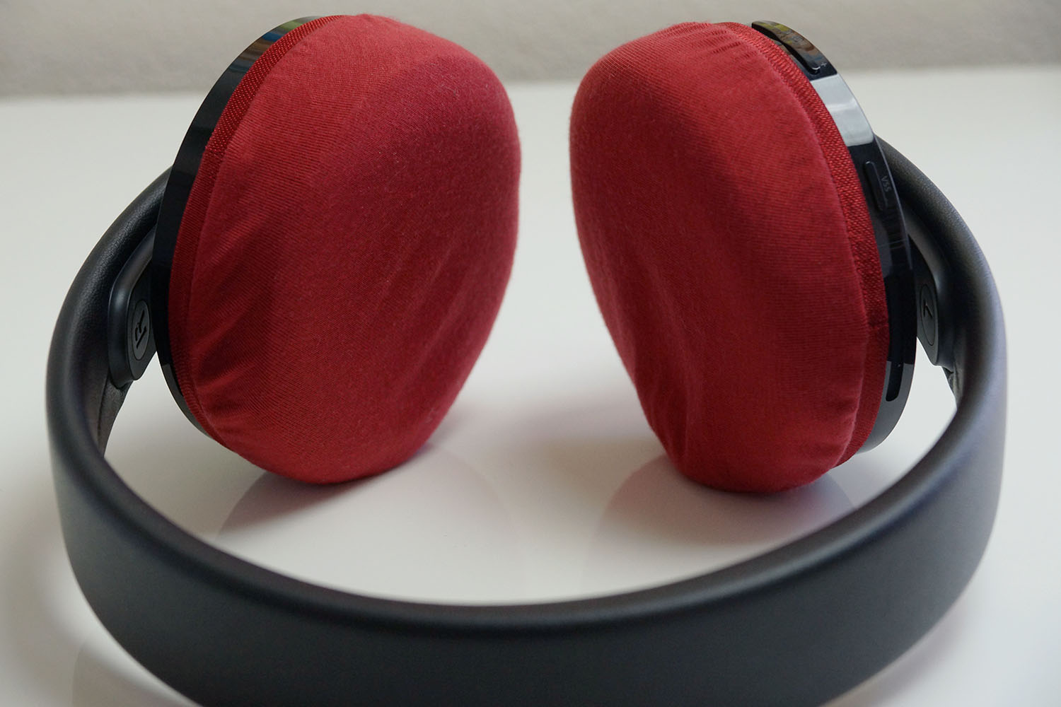 当戴封套时,建议将封套的橡胶带部分略微覆盖到耳罩边缘的耳垫上,不要超过耳罩与耳垫的边界。(请参考上面的照片。)