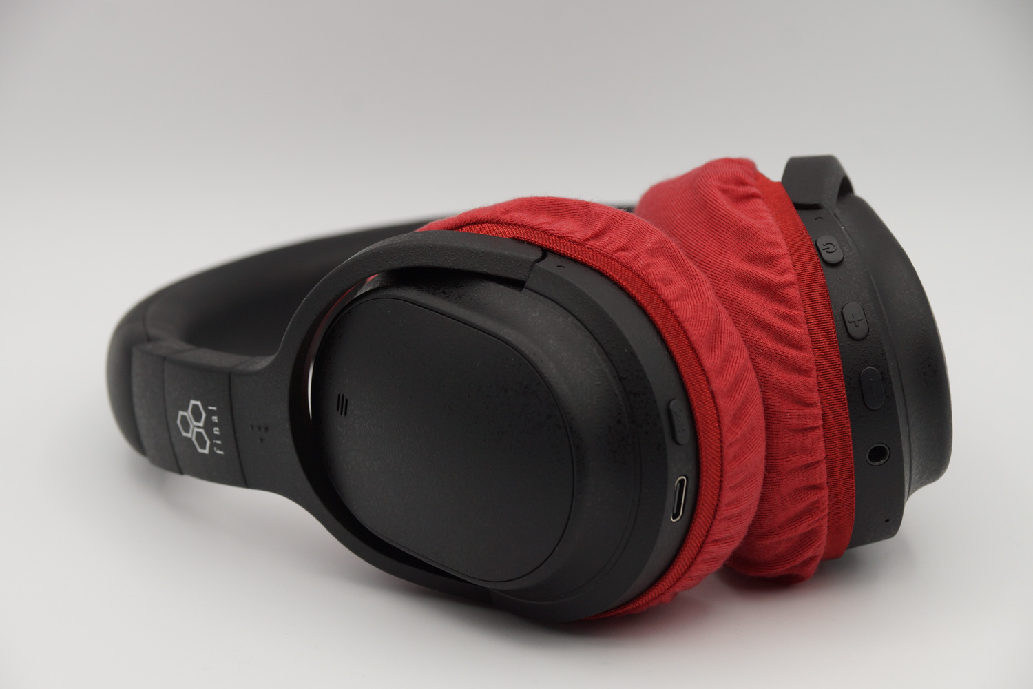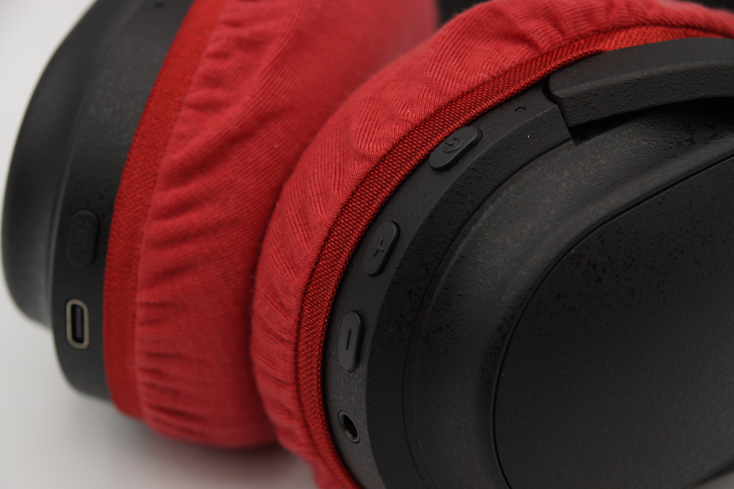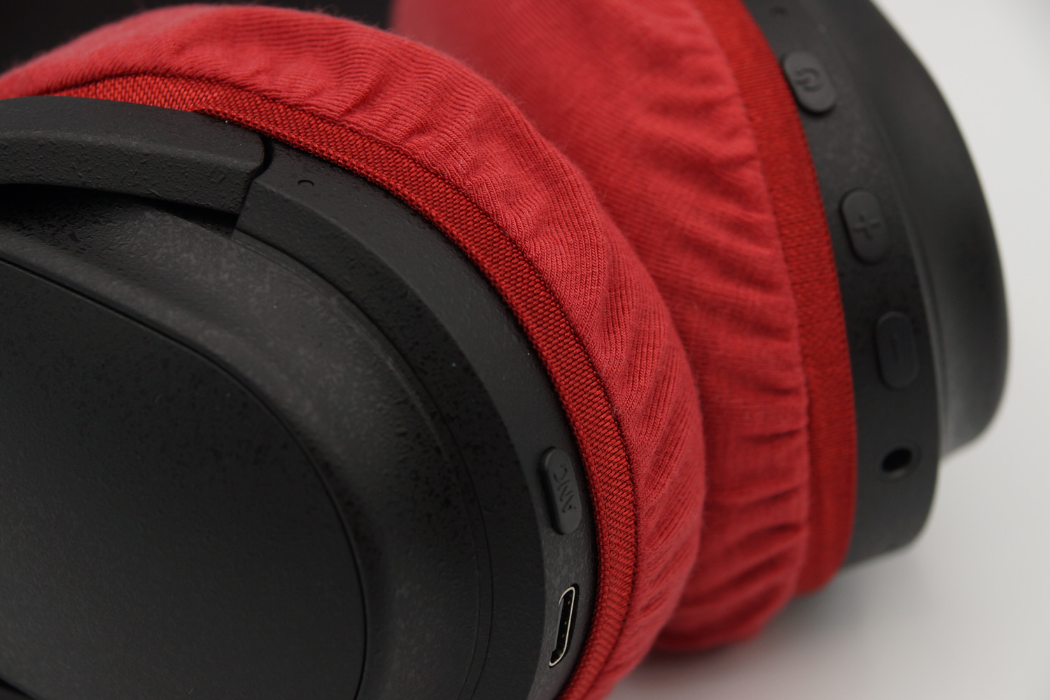 イヤーカップの上半分は、ヘッドバンドとの接続部のヒンジの部分とイヤーカップの間の段差にゴムをひっかけるように装着し、イヤーカップの下の部分はカバーのゴムバンドがボタン類を隠さない程度に浅く被せるのがお勧めです。(※上の写真をご参照ください)