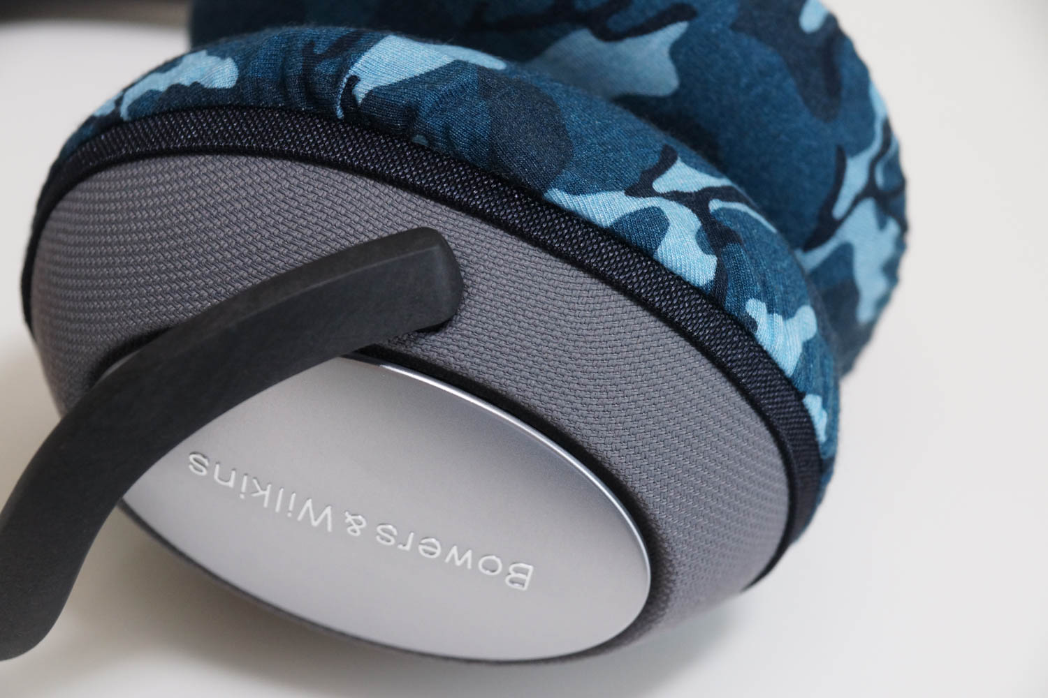 이 헤드폰은 하이엔드 오디오로 유명한 브랜드 "Bowers&Wilkins"의 무선 헤드폰입니다. 단순하면서도 독특한 디자인으로, 헤드밴드와 이어컵은 외부가 패브릭으로 덮여 있고 내부는 합성 가죽으로 감싸져 있습니다. 이어컵에는 고급스러운 양각 처리된 메탈 플레이트가 장식되어 있습니다. 이런 독특한 디자인과 함께, 고급스럽고 세련된 외관이 매력적입니다.
