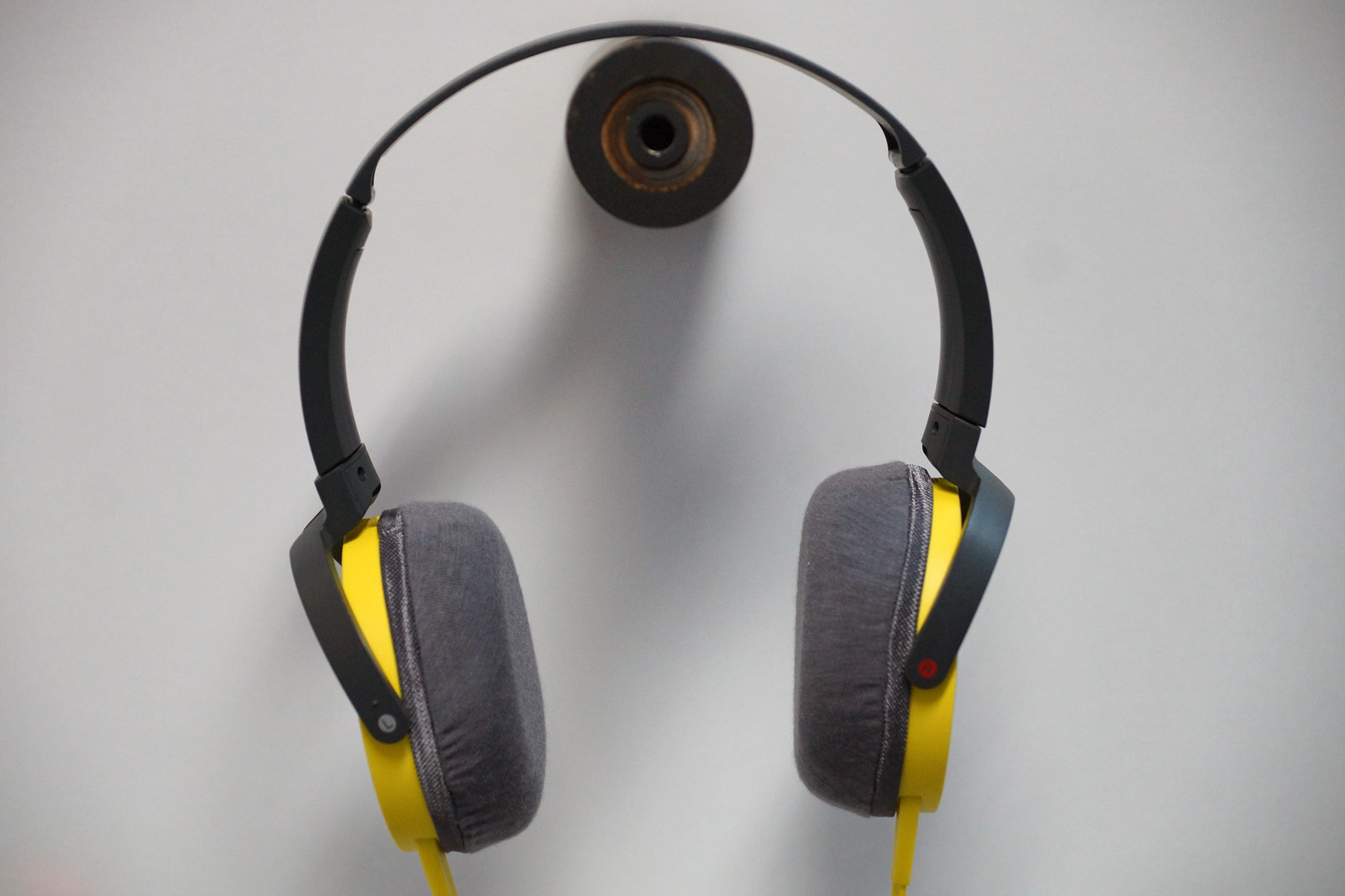 SONY MDR-XB450のイヤーパッドの修理や装着感の改善にmimimamoを使用する場合(※写真はMサイズの装着例 ※撮影協力:e☆イヤホン秋葉原店)