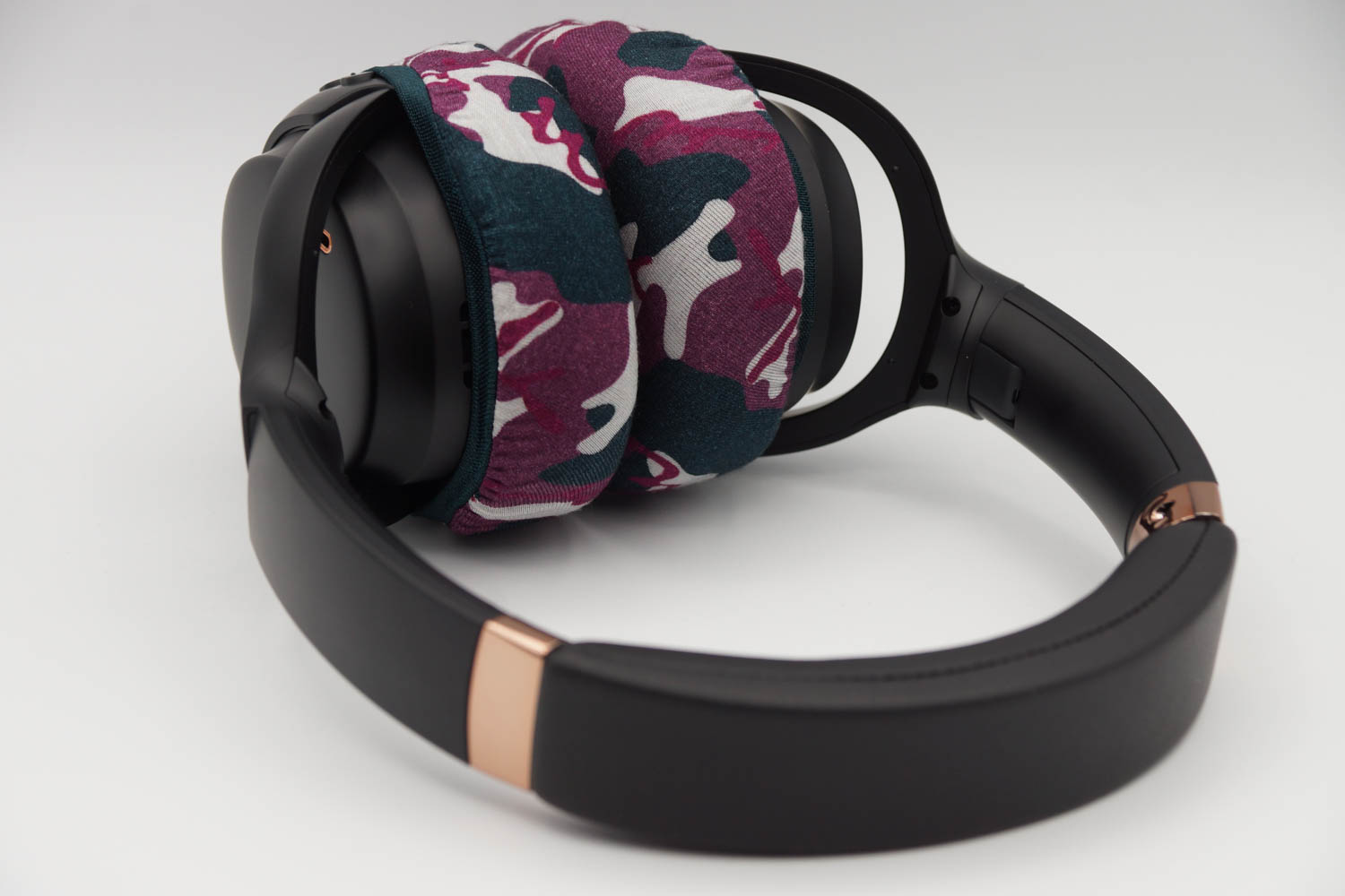 此蓋子在垂直和水平方向上的伸展率不同,垂直方向的伸展更好。由於這款耳機有垂直長的耳墊,所以使蓋子垂直放置(在它伸展良好的方向上)會有更好的貼合感。